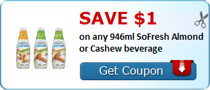 Save $1.00 on any 946ml SoFresh Almond or Cashew beverage with this printable SmartSource coupon.